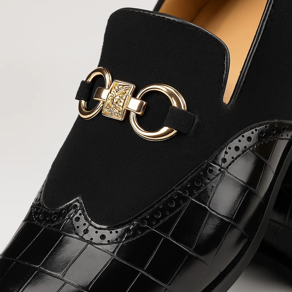 „Valerio™ definiert Herrenschuhe mit der perfekten Harmonie aus Komfort, Details und Design neu. Die Verarbeitung aus echtem Leder und die glatte Wildlederstruktur verleihen jedem Anlass Eleganz.“