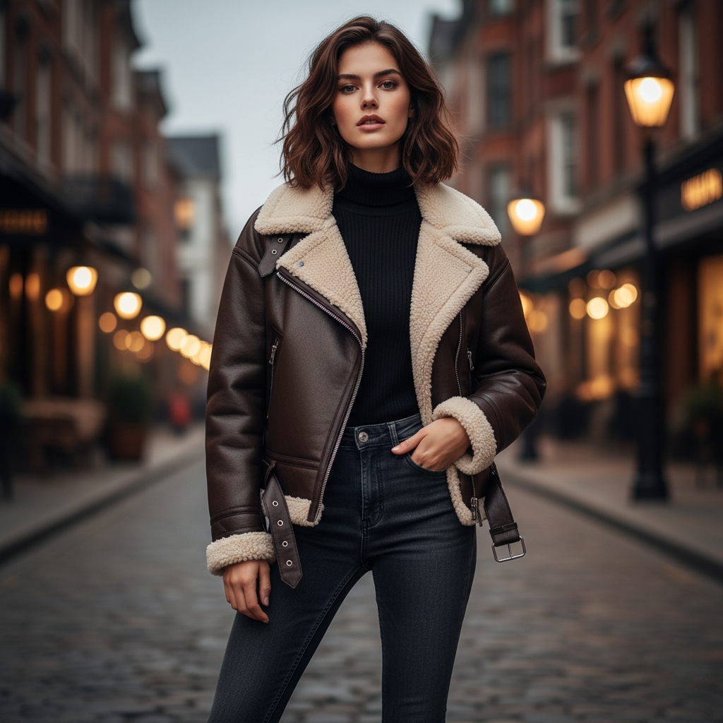 מעיל טייסים זה משלב עור טבעוני פרימיום עם א בטנת גזירה רכה לחום גבוה ונוחות יומיומית. גזרת הטייסים המותאמת ופרטי המתכת המעודנים שלו יוצרים צללית מתוחכמת - היצירה האידיאלית לבקרים קרים ולסגנון חסר מאמץ ובטוח.