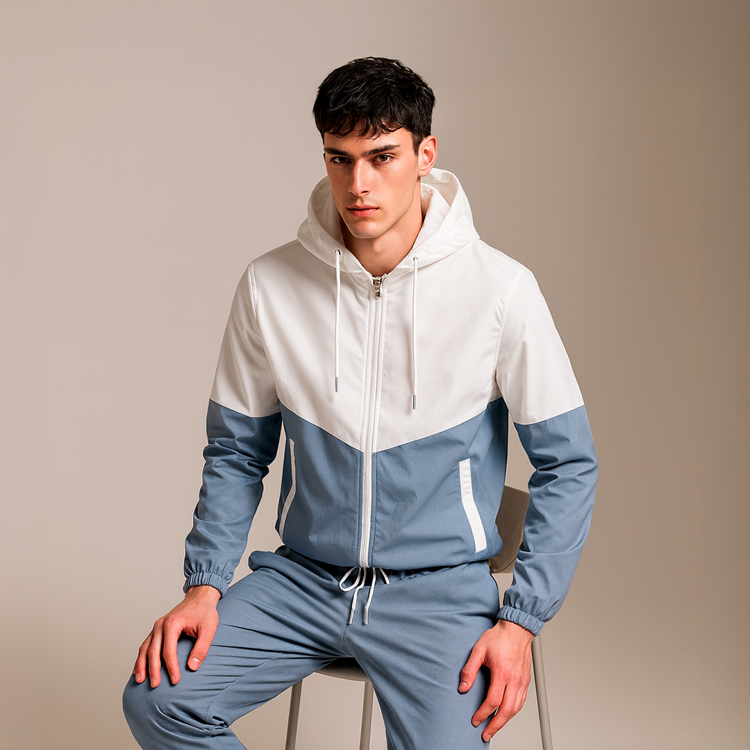 Hooded zip-up jacket with modern color-block design